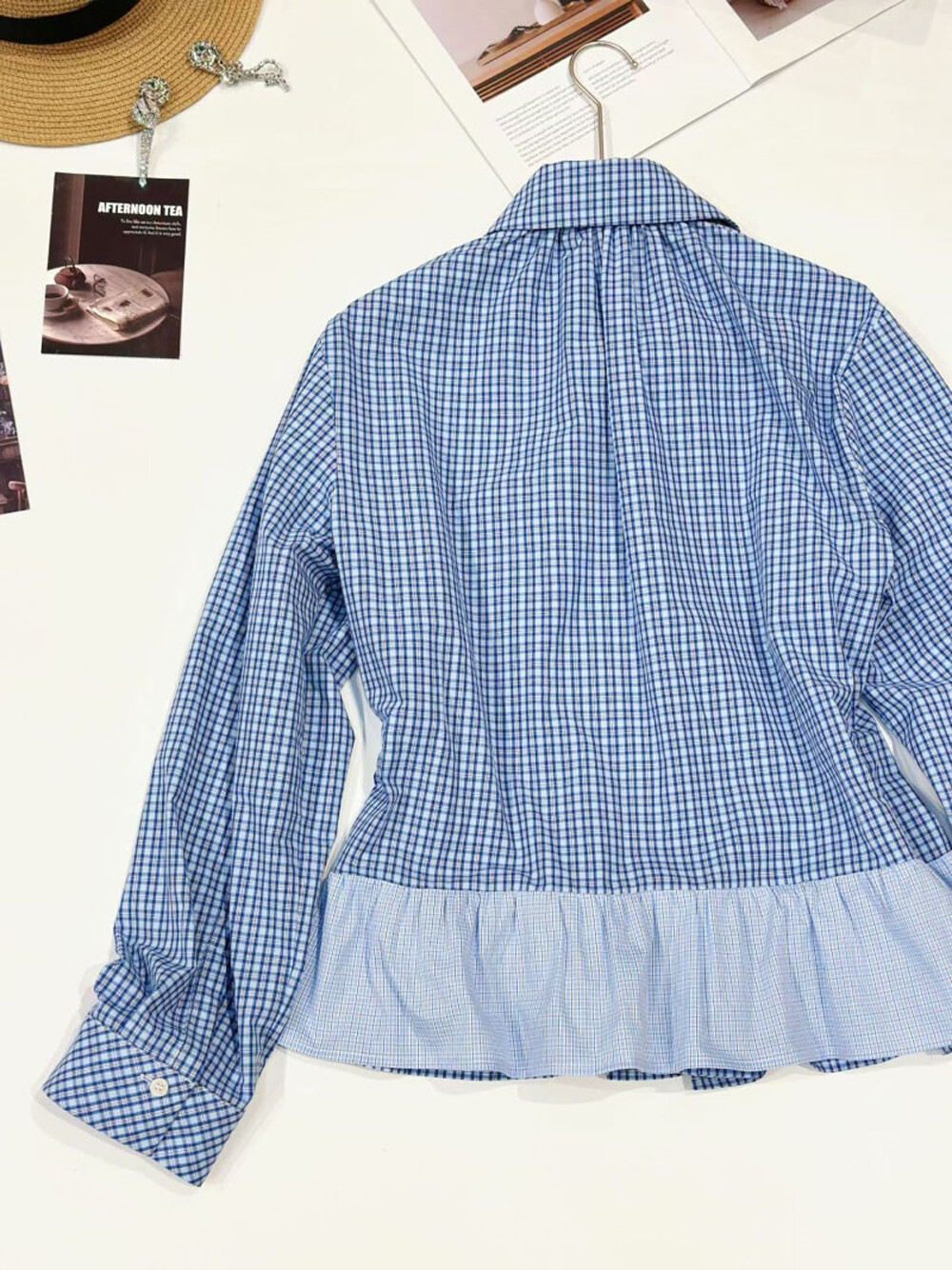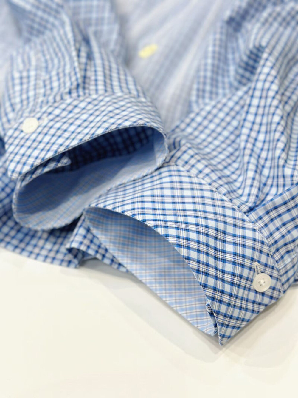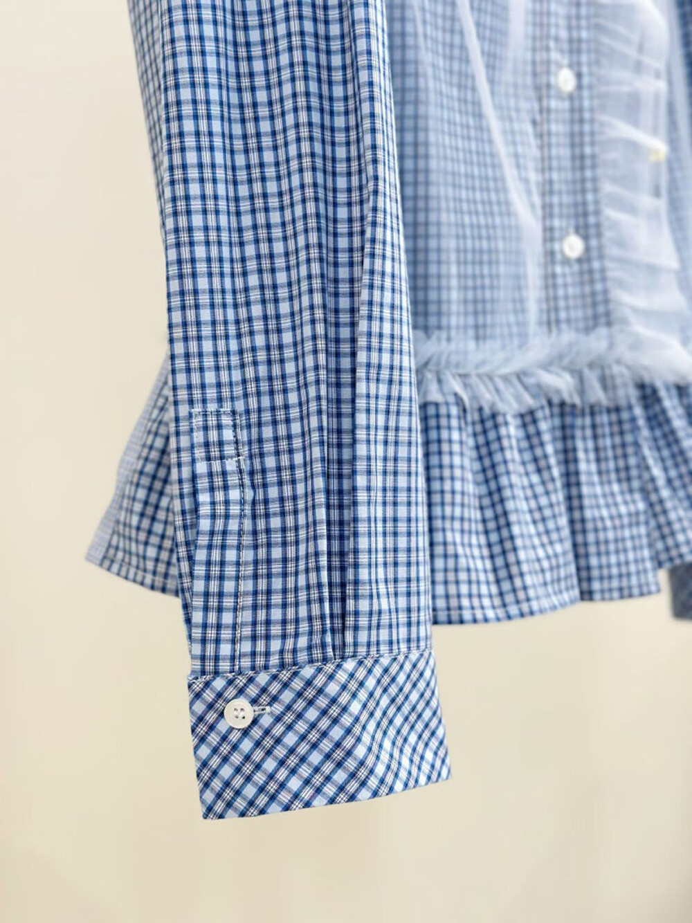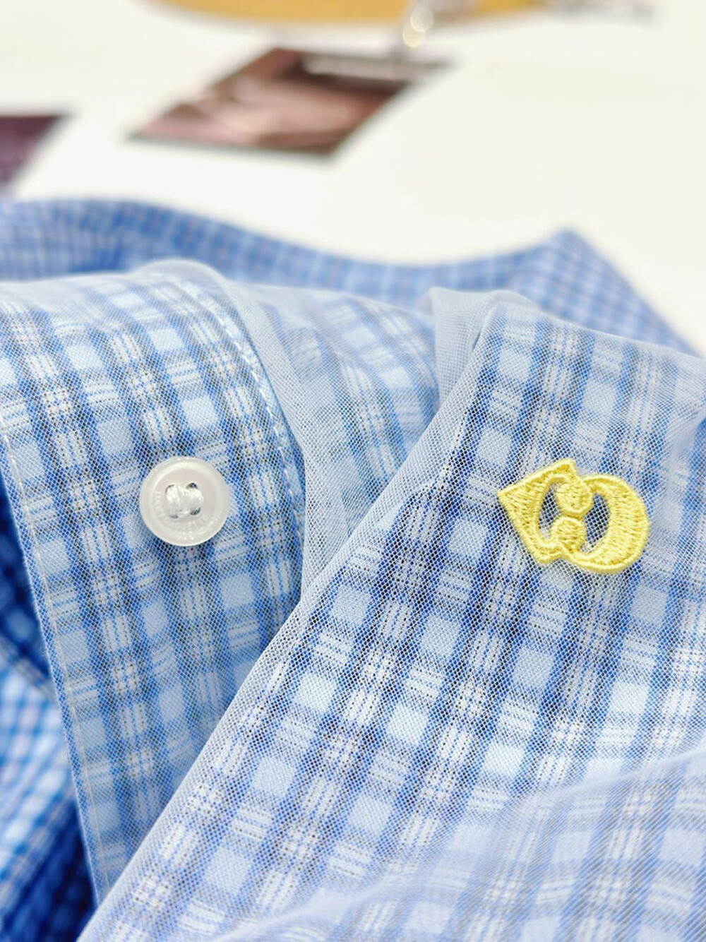 - 코튼 100%의 블루 잔체크 패턴 소재와 메시 소재를 믹스해 제작.